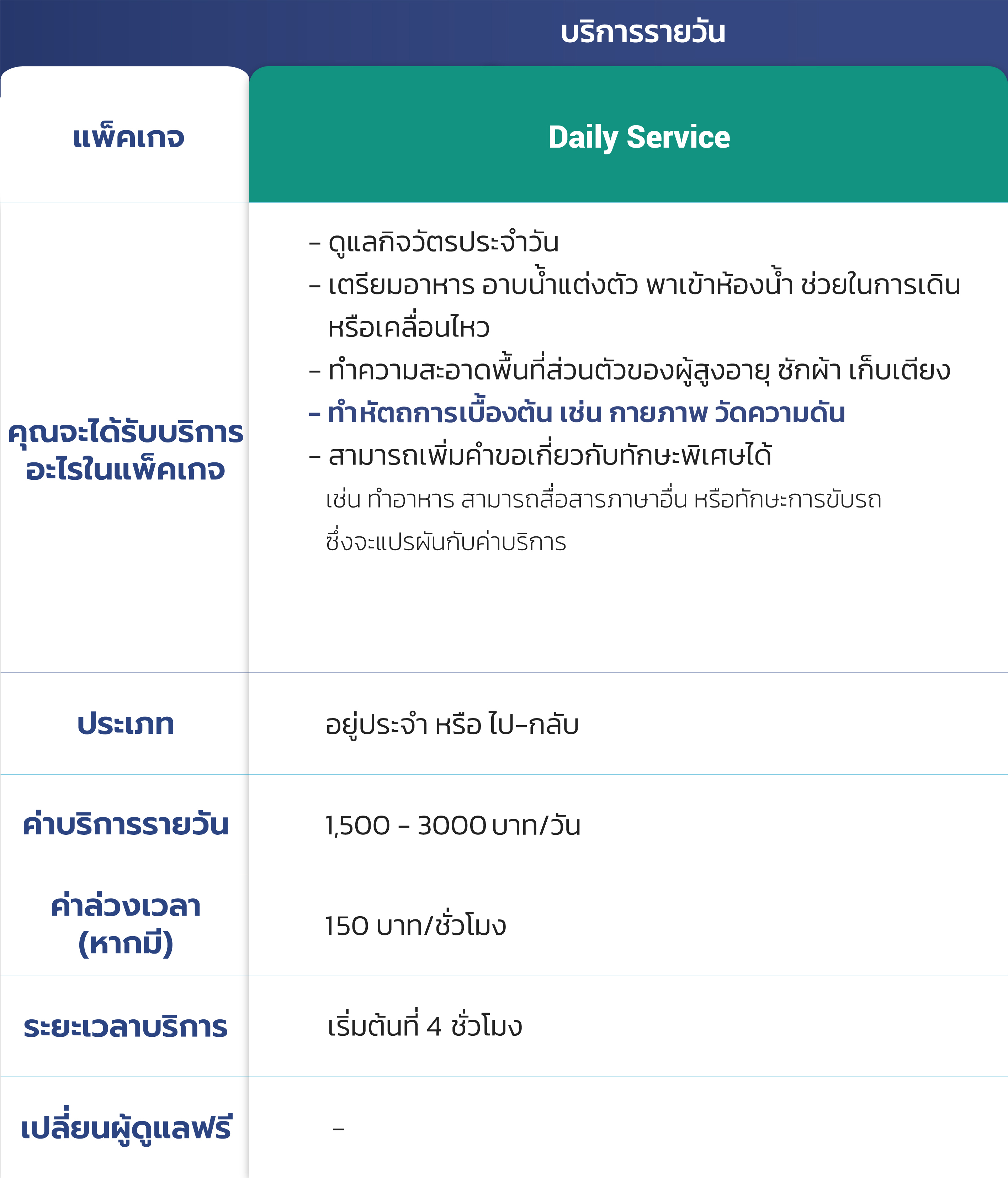 **ค่าบริการประกอบด้วย : ค่าบริการวางแผนและจับคู่ระหว่างนายจ้างและลูกจ้าง, เงินเดือนผู้ดูแล, ค่ารับประกันการหาคนมาแทน, การเช็คประวัติอาชญากรรม, เครื่องแบบ, และค่าธรรมเนียมการสัมภาษณ์