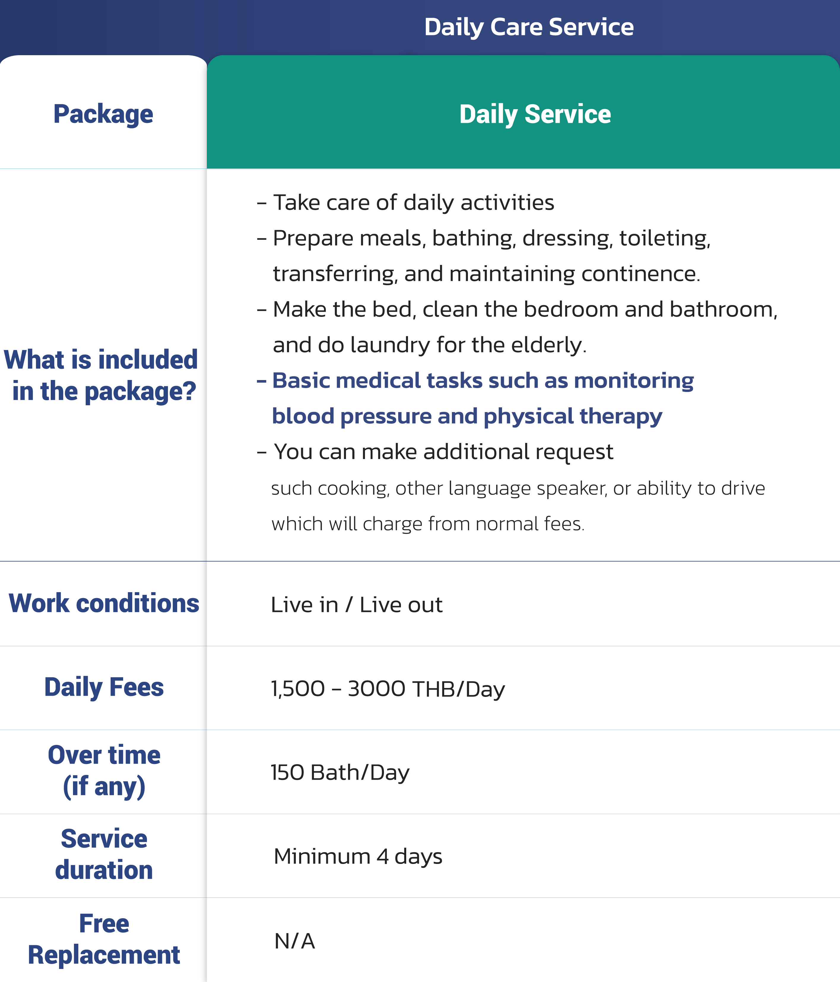 **Service fee includes: service planning and matching between employer and employee, caregiver’s salary, replacement guarantee, criminal background check, uniform, and interview fee.