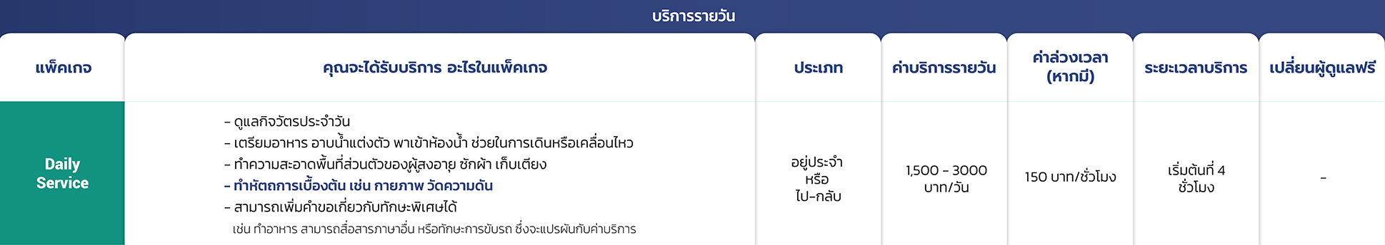 **ค่าบริการประกอบด้วย : ค่าบริการวางแผนและจับคู่ระหว่างนายจ้างและลูกจ้าง, เงินเดือนผู้ดูแล, ค่ารับประกันการหาคนมาแทน, การเช็คประวัติอาชญากรรม, เครื่องแบบ, และค่าธรรมเนียมการสัมภาษณ์